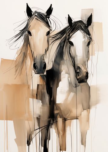Plakat z serii wnętrza zatytułowany Dusze na Wolności. Ten artystyczny obraz przedstawia dwie abstrakcyjne sylwetki koni, uchwycone w dynamicznych, niemal eterycznych pociągnięciach pędzla. Neutralna paleta barw z dominującymi odcieniami beżu i czerni, podkreślona jest przez akcenty i plamy, co nadaje dziełu głębi i tekstury. Artystyczne, swobodne linie i plamy tuszu tworzą wrażenie ruchu i wolności, wywołując emocjonalne rezonanse z widzem. Plakat jest idealnym wyborem dla miłośników koni, sztuki współczesnej i abstrakcyjnego ekspresjonizmu, będąc nie tylko dekoracją, ale także wyrafinowanym elementem w przestrzeniach takich jak salony, biura, czy galerie sztuki.