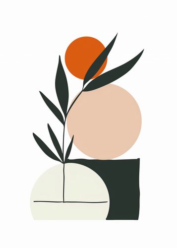 Plakat z serii boho zatytułowany Kompozycja Natury. Grafika łączy proste formy geometryczne z elementami przyrody, tworząc obraz, który jest jednocześnie nowoczesny i organiczny. Zestawienie gładkich, zaokrąglonych kształtów z ostrymi, ciemnymi liśćmi wprowadza wizualne napięcie, a pomarańczowa kula na wierzchołku gałązki przypomina zachodzące słońce lub soczysty owoc. Palecie barw dominują stonowane odcienie, które razem tworzą kojącą i zrelaksowaną atmosferę.Dzieło to doskonale sprawdzi się w przestrzeniach, które aspirują do stworzenia spokojnego i zbalansowanego wnętrza, takich jak jadalnie, poczekalnie lub pokoje relaksacyjne. Może także pełnić funkcję spajającą w pomieszczeniach z elementami zielonymi, takimi jak domowe ogrody zimowe czy salony w stylu eko.
