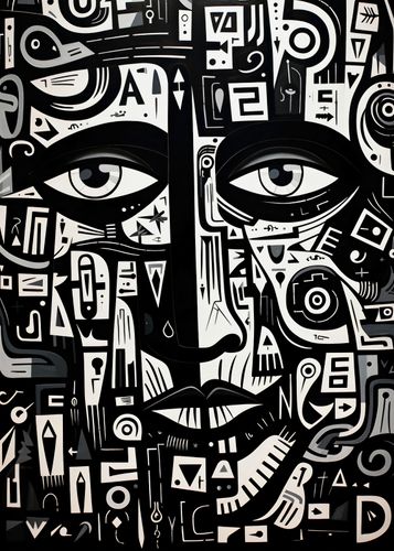 Plakat z serii abstrakcja zatytułowany Labirynt Myśli. Intrygujące oczy spoglądające z głębi obrazu są otoczone złożonymi wzorami i symbolami, które łączą się, tworząc enigmatyczny portret. Czarno-białe barwy kontrastują ze sobą, dodając dziełu intensywności i głębi. Złożoność wzorów symbolizuje skomplikowane myśli i emocje, które kryją się za ludzkim spojrzeniem. Świetnie sprawdzi się w nowoczesnych biurach, galeriach sztuki oraz w przestrzeniach przeznaczonych dla miłośników abstrakcyjnej ekspresji.