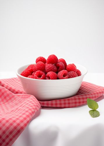 Plakat z serii wnętrza zatytułowany Lato w Misce. Na plakacie widnieje pełna misa soczystych, dojrzałych malin, które kontrastują swoją intensywną czerwienią z czystą bielą naczynia i tłem. Rozłożona obok misy czerwono-biała, kratka serwetka dodaje wiejskiego uroku, a pojedynczy listek mięty wprowadza świeży akcent. Ten plakat przyciąga wzrok swoją prostotą i elegancją, idealnie uchwycając esencję letniego sezonu i świeżości owoców. Doskonały do ożywienia kuchni, jadalni, a także jako element dekoracyjny w przestrzeniach, gdzie chce się wprowadzić nutę świeżości i naturalnego piękna. Zaprasza do celebracji zdrowego stylu życia i radości płynącej z prostych przyjemności.