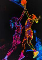 Plakat z serii abstrakcja zatytułowany Mecz W Kosza. Przedstawia żywą i dynamiczną scenę z gry w koszykówkę, w której dwie zawodniczki rywalizują o piłkę. Graczka w pierwszym planie wykonuje skok do kosza w akcie rzutu lub bloku, rozciągając się w pełnej koncentracji, podczas gdy jej przeciwniczka stara się ją zablokować. Figury sportowców są przedstawione w intensywnych, neonowych kolorach, które kontrastują z ciemnym tłem, co nadaje scenie energiczny i ekscytujący charakter. Kolory są rozmieszczone na postaciach w sposób, który podkreśla ich ruch i ekspresję, a także oddaje dynamikę i szybkość sportowej akcji. Plakat ten idealnie oddaje ducha sportowej rywalizacji i mogłby być inspirującym dodatkiem do wnętrza dla miłośników koszykówki i sportu.
