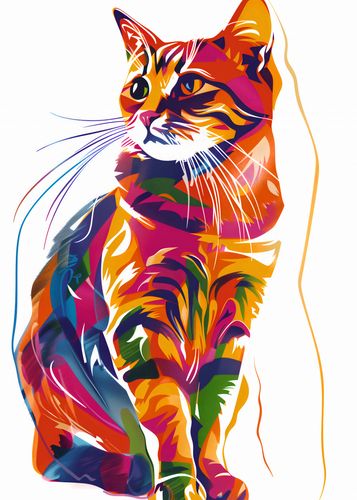 Plakat z serii abstrakcja zatytułowany Nasycony Kot prezentuje kota w stylu pop art, którego futro jest kolażem żywych i nasyconych kolorów, tworząc wizualnie hipnotyzujący efekt. Wzrok kota, z głębokimi i bystrymi oczami, wydaje się śledzić coś poza ramą obrazu, dodając tajemniczości i życia tej grafice. Ekspresyjne linie i kształty, które definiują postać, są odważne i dynamiczne, co podkreśla niezależny charakter zwierzęcia. Ta energetyczna i barwna ilustracja przyciąga wzrok i jest doskonałym dodatkiem do nowoczesnych przestrzeni, które chcą dodać odrobiny kreatywności i koloru, idealna do salonów, studiów artystycznych lub pokoi młodzieżowych.
