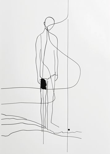 Plakat z serii minimalistyczne zatytułowany Samotna Wędrówka.Plakat przedstawia postać człowieka przedstawionego za pomocą zredukowanych linii, która wyraża elegancję i prostotę. Postać z dużym plecakiem jest uchwycona od tyłu, sugerując podróż lub długą wędrówkę. Linie przypominające krajobraz na dole obrazu i pojedynczy czarny punkt mogą symbolizować dalekie cele lub przemyślenia wędrowca. Ten minimalistyczny rysunek wprowadzi do wnętrza atmosferę refleksji i poszukiwania, będąc doskonałym wyborem do przestrzeni, które inspirują do myślenia i odkrywania, takich jak gabinety, studia czy nawet miejsca publiczne, gdzie sztuka ma za zadanie pobudzać do przemyśleń.
