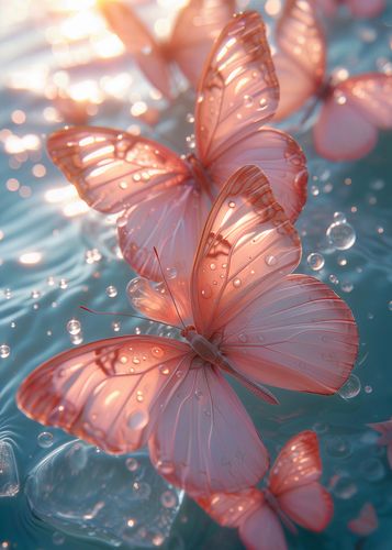 Plakat z serii natura zatytułowany Świetliste Motyle. Na plakacie widzimy delikatne motyle o przezroczystych, różowych skrzydłach, unoszące się nad wodą i łagodnie odbijające światło słoneczne. Kropelki wody na ich skrzydłach dodają uczucia świeżości i czystości. Plakat emanuje spokojem i pięknem, idealnie nadając się do przestrzeni, które chcą wprowadzić element relaksu i spokoju, takich jak spa, pokoje medytacyjne, a także jako łagodny element dekoracyjny do domu.
