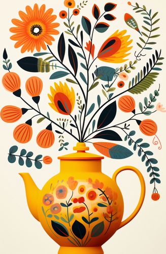 Plakat z serii wnętrza zatytułowany Bujna Herbata. Zachwycające, soczyste barwy kwiatów i liści wyrastających z eleganckiego żółtego dzbanka do herbaty, na którym uwagę przyciągają malowane motywy roślinne. Wzory i kolory wspaniale harmonizują ze sobą, tworząc kompozycję pełną życia i radości. Delikatne linie i estetyczny układ sprawiają, że prace ożywiają każdą przestrzeń. Świetnie sprawdzi się w kawiarniach, herbaciarniach jak i również w domowych jadalniach czy salonach.