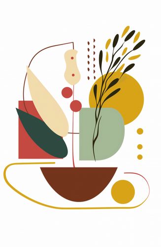 Plakat z serii minimalistyczne zatytułowany Harmonia Natury Martwej. Grafika ta to nowoczesna interpretacja klasycznego motywu natury martwej, gdzie geometryczne formy łączą się z delikatnymi roślinnymi akcentami. Paleta barw jest ciepła i ziemista, z akcentami głębokiego czerwieni, spokojnych zieleni i musztardowych żółci, wszystkie umieszczone na jasnym tle, co nadaje pracy subtelność i lekkość.Ten plakat świetnie komponuje się z wnętrzami, które cenią sobie spokój i równowagę, a także z przestrzeniami, które chcą wnieść do swojego otoczenia sztukę inspirowaną naturą. Może być wyjątkowym dodatkiem do salonu, przestrzeni relaksacyjnej, czy jako estetyczny akcent w jadalni.