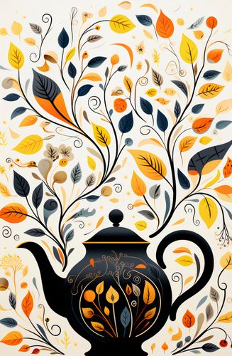 Plakat z serii wnętrza zatytułowany Jesienna Melodia. Czarny dzbanek do herbaty, zdobiony subtelnymi złotymi i pomarańczowymi wzorami, z którego wyrastają kolorowe liście i kwiaty, przypominające jesienny ogród pełen życia. Kompozycja wypełniona jest ciepłymi barwami złota, pomarańczy i brązu, które kontrastują z eleganckim czernią dzbanka. Te detale dodają obrazowi nuty elegancji i spokoju. Świetnie sprawdzi się w herbaciarniach, księgarniach jak i również w domowych salonach czy biblioteczkach.
