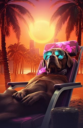 Plakat z serii pop art zatytułowany Lato w Stylu. Na tej zabawnej ilustracji widzimy psa rasy labrador, wygodnie ułożonego na leżaku plażowym, w okularach przeciwsłonecznych, z tłem zachodzącego słońca i palm. Jego relaksująca poza i luźny styl, w połączeniu z żywymi kolorami tropikalnego wschodu lub zachodu słońca, oddają atmosferę beztroskich wakacji. Plakat ten jest idealnym wyborem dla miłośników psów i letnich klimatów, świetnie nadaje się do dekoracji ścian w domach, hotelach nad morzem, czy jako dodatek do letnich barów i restauracji, wprowadzając element humoru i wakacyjnego luzu.