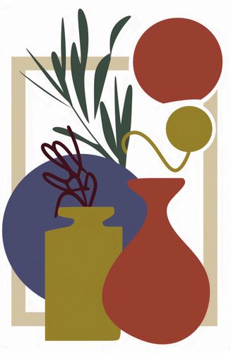 Plakat z serii minimalistyczne zatytułowany Natury Martwe. Ta kompozycja artystyczna zanurza tradycyjny motyw natury martwej w nowoczesnym, geometrycznym stylu. Różnorodne formy waz w żywych kolorach kontrastują z delikatnymi odcieniami zielonych liści, tworząc równowagę między prostotą a bogactwem form. Elementy te łączą się, tworząc elegancką i stylową całość.Ten plakat będzie wyjątkowym dodatkiem do każdego wnętrza, od klasycznie urządzonych po współczesne. Jego stonowane barwy i geometryczne kształty doskonale nadadzą się do przestronnych salonów, jadalni czy nowoczesnych biur. Jest to idealne dzieło dla tych, którzy cenią harmonię i chcą dodać do swojej przestrzeni szczyptę elegancji.