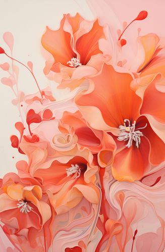 Plakat z serii wnętrza zatytułowany Płynąca Pasja. Wspaniałe, pełne życia kwiaty w odcieniach koralu i łososiowego różu, których płatki rozprzestrzeniają się niczym płynne abstrakcje, przypominające tańczące płomienie. Środek kwiatu z delikatnym białym kwieciem dodaje nuty delikatności i elegancji. Barwy ciepłe i intrygujące jednocześnie kontrastują z subtelnie różowym tłem, tworząc kompozycję pełną pasji i romantyzmu. Świetnie sprawdzi się w spa, salonach kosmetycznych jak i również w sypialniach czy salonach o wyrafinowanym wnętrzu.