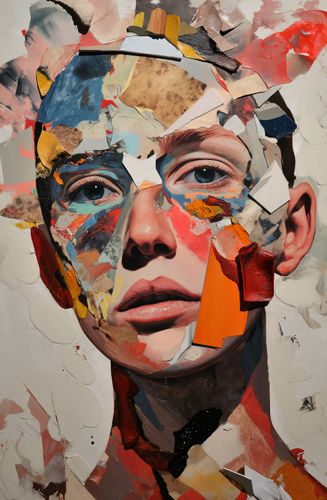 Plakat z serii abstrakcja zatytułowany Podział Samego Siebie, przedstawia twarz złożoną z rozmaitych, nieregularnych kawałków, które łączą się w zaskakująco spójną całość. Każdy fragment jest jak pociągnięcie pędzla, pełne tekstury i żywych kolorów, od ciepłych odcieni pomarańczy i czerwieni, po subtelne biel i brąz. Wzrok widza jest przyciągany do intensywnych, realistycznych oczu, które wydają się obserwować z za rozdrobnionej mozaiki. Plakat ten mógłby znaleźć swoje miejsce w nowoczesnych galeriach sztuki, studiach projektowych, lub jako odważny akcent w minimalistycznych, współczesnych przestrzeniach. Jego abstrakcyjny, ale wyrazisty design stwarza punkt konwersacyjny i może być interpretowany jako komentarz do złożoności ludzkiej tożsamości i percepcji.