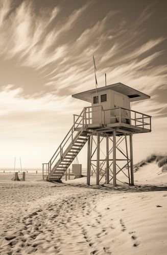Plakat z serii pejzaże zatytułowany Strażnik Wydm. Prezentuje on sepiową scenę z wieżą ratownika na pustej plaży. Nostalgiczna tonacja obrazu podkreśla samotność struktury i piękno otaczającej ją dzikiej przyrody. Dramatyczne chmury na niebie i ślady na piasku prowadzą wzrok ku wieży, dodając głębi i historii miejscu. Ten plakat idealnie nadaje się do wnętrz, w których pragnie się wywołać uczucie spokoju, przestrzeni i czasów minionych, takich jak salony, pokoje wypoczynkowe, a także przestrzenie publiczne lub prywatne biura, które cenią sobie klasyczny wygląd i atmosferę.
