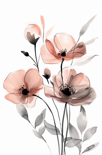 Plakat z serii wnętrza zatytułowany Subtelny Okaz to artystyczna interpretacja delikatnych kwiatów maku. Ilustracja przedstawia kwiaty w pastelowych odcieniach różu i pomarańczy z subtelnymi szarości i akcentami czerni, co nadaje kompozycji miękkiego i eterycznego charakteru. Przezroczyste płatki z lekko zarysowanymi konturami są przedstawione na tle w tonacji jasnego beżu, co pozwala na pełne skupienie na delikatności i pięknie kwiatów. Wykorzystanie minimalizmu i delikatności kolorów sprawia, że plakat emanuje spokojem i elegancją. Idealny do przestrzeni, które cenią sobie spokój i naturę, takich jak salony spa, pokoje gościnne, czy jadalnie, gdzie może dodać odrobinę subtelnego uroku i świeżości.