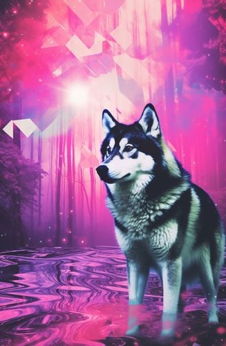 Plakat z serii pop art zatytułowany Wilczy Duch. Ta hipnotyzująca grafika łączy w sobie realistyczny wizerunek wilka z eterycznym, neonowym lasem w tle, co nadaje scenie onirycznego, mistycznego charakteru. Wilk, przedstawiony w pełnym majestacie, stoi na brzegu zaczarowanego jeziora, a tajemnicze, geometryczne kształty unoszą się w powietrzu, dodając kompozycji elementu fantastyki. Wyraziste kolory różu i fioletu tworzą niemal bajkową atmosferę. Plakat jest idealnym wyborem dla miłośników natury i jej mistycznych aspektów, świetnie nadaje się do wnętrz o tematyce przyrodniczej, pokojów dla młodzieży, lub jako unikatowy element dekoracyjny w przestrzeniach współczesnych.