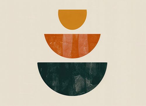 Plakat z serii boho zatytułowany Cykl Natury. Plakat przedstawia trzy przecinające się półkola, ułożone w pionowym szeregu, z których każde posiada unikalną fakturę i paletę barw - od spokojnego, złotego odcienia u góry, przez głęboką pomarańcz z akcentami ciepłej czerwieni pośrodku, do ciemnej, tajemniczej zieleni u dołu. Ta kompozycja wywołuje wrażenie harmonijnego przepływu czasu lub cykli natury. Świetnie sprawdzi się jako dekoracja w nowoczesnych przestrzeniach, takich jak minimalistyczne biura, salony w stylu skandynawskim, a także jako wyrafinowany akcent w strefach wypoczynkowych kawiarni lub butikowych hoteli.