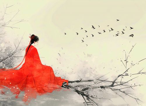 Plakat z serii motywy wschodnie zatytułowany Diva Na Gałęzi. Plakat przedstawia eteryczną scenę utrzymaną w delikatnej palecie barw z przewagą odcieni szarości i bieli, która kontrastuje z wyrazistą czerwienią. Na pierwszym planie widzimy postać kobiety w tradycyjnym, czerwonym stroju, z eleganckim uczesaniem i ozdobami we włosach, co sugeruje kulturalne lub historyczne znaczenie ubioru. Siedzi ona na gałęzi drzewa, a jej sukienka płynnie przechodzi w linie, które mogą symbolizować wiatr lub wodę, dodając grafice dynamiki. Tło jest stonowane i minimalistyczne, z subtelnymi plamami farby tworzącymi delikatną atmosferę. Nad sceną unosi się stado ptaków, które wzbija się do lotu, co może symbolizować wolność lub przejście. Całość kompozycji emanuje spokojem, melancholią i pięknem natury, a także może sugerować opowieść lub głębsze znaczenie skryte w postaci kobiety i jej połączeniu z otoczeniem.