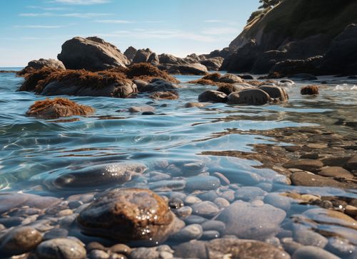 Plakat z serii pejzaże Harmonia Przybrzeżna przedstawia idylliczną scenę nadmorskiego krajobrazu, gdzie spokojne, krystalicznie czyste wody delikatnie odbijają skaliste wybrzeże. Skały pokryte morskimi wodorostami i okrągłe kamienie na pierwszym planie stanowią kontrast dla miękkiej tekstury wody. To artystyczne dzieło przypomina o naturalnej elegancji i spokoju, jakie można znaleźć w naturze. Plakat doskonale wpasuje się w przestrzenie pełne naturalnego światła i organicznych elementów, takie jak salon z widokiem na morze, gabinet relaksacyjny, czy przestrzeń wellness w luksusowym hotelu czy spa.