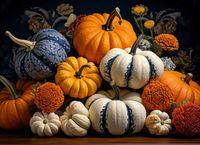 Plakat z serii natura zatytułowany Jesienne Bogactwo. Ta kompozycja to celebracja urodzaju jesieni, ukazująca bogactwo i różnorodność dyń w pełnej krasie. Kontrastujące faktury i kolory od kremowej bieli do głębokiej pomarańczy są uzupełnione o ciepłe odcienie złotych kwiatów, tworząc obraz, który emanuje ciepłem i domową atmosferą. Idealny do dekoracji kuchni lub jadalni, gdzie może inspirować do sezonowych przetworów i przygotowań świątecznych potraw. Ten plakat będzie również doskonałym dodatkiem do przestrzeni takich jak sklepy z dekoracjami domowymi, kawiarnie lub restauracje, które chcą wprowadzić atmosferę przytulności i naturalnego piękna.