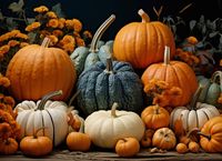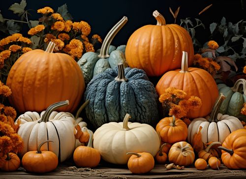 Plakat z serii natura zatytułowany Jesienne Urodzaje przedstawia bujne bogactwo jesieni. Centralne miejsce zajmuje soczysta, pomarańczowa dynia, królowa jesieni, otoczona przez różnorodność jej barwnych odmian. Niebieskawe i białe dynie tworzą wyjątkowy kontrast, a wszystko to uzupełnione jest przez złociste i burgundowe chryzantemy, które dodają kompozycji ciepła i głębi. Całość osadzona jest na tle w klasycznych, ciemnych odcieniach, co podkreśla elegancję i dojrzałość sezonu. Plakat ten idealnie wpasuje się w przestrzeń kuchni lub jadalni, dodając jej charakteru oraz ciepłego, domowego klimatu. Doskonale odnajdzie się także w przestrzeniach takich jak winiarnie czy restauracje serwujące sezonowe dania, gdzie podkreśli bogactwo i obfitość jesiennej palety smaków.