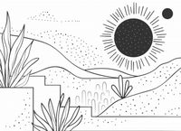 Plakat z serii minimalistyczne zatytułowany Linearny Pejzaż. Plakat przedstawia liniową ilustrację krajobrazu w czerni i bieli, gdzie przestrzeń zapełniają delikatne linie, kropki i abstrakcyjne formy roślinności. Centralnym punktem jest stylizowane słońce z promieniami rozchodzącymi się we wszystkie strony, towarzyszy mu mniejsze ciało niebieskie, które może symbolizować planetę lub księżyc. Lekkie kropki sugerują obecność piasku lub gwiazd, dodając elementu fantazji. Ten plakat wprowadzi do każdej przestrzeni element spokoju i prostoty. Idealnie nadaje się do nowoczesnych przestrzeni, takich jak minimalistyczne biura, jadalnie czy pokoje młodzieżowe, dostarczając neutralnej palety, która pasuje do wielu schematów kolorystycznych i stylów dekoracyjnych.