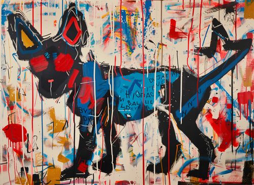 Plakat z serii abstrakcja zatytułowany Miejski Pies. Żywa kompozycja przedstawia sylwetkę psa w stylu street art w której dominują kolory takie jak czerwień, niebieski i żółty, które są rozmieszczone na płótnie w sposób dynamiczny i spontaniczny. Praca wydaje się być pełna ruchu dzięki pociągnięciom pędzlem i kroplom farby rozpryskującym się w różnych kierunkach. Na pierwszy plan wyłania się czarna sylwetka psa, której kontury są podkreślone kontrastującymi barwami i szkicowym stylem. W tle można dostrzec chaotyczne linie i formy, które mogą symbolizować miejski chaos i energię, a także fragmenty tekstu, które dodają dziełu charakteru ulicznego muralu. Całość sprawia wrażenie radosnej i pełnej energii ekspresji artystycznej. Świetnie sprawdzi się w nowoczesnych przestrzeniach miejskich.