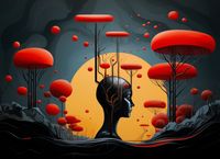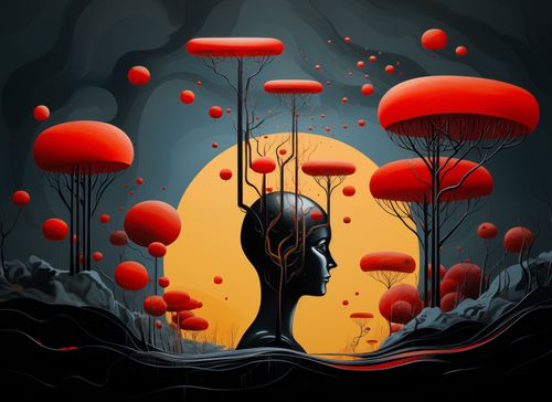 Plakat z serii pop art zatytułowany Myślokształty. Ten plakat przedstawia profil człowieka z głową pełną drzew, które wydają się być przedłużeniem jego myśli i świadomości, symbolizując połączenie umysłu z naturą. Drzewa mają formę fantastycznych, czerwonych kształtów przypominających grzyby, a ich rozgałęzienia łączą się z otaczającą atmosferą, z której unoszą się podobne formacje. Kontrastujące kolory, z dominującym czerwieniem i spokojnym tłem, tworzą wizualny dialog między rzeczywistością a wyobraźnią. Plakat zaprasza do refleksji nad bogactwem wewnętrznego świata i jego wpływem na percepcję zewnętrznej rzeczywistości, będąc wyjątkowym dodatkiem do każdego środowiska poszukującego głębi i inspiracji. BIAŁY MARGINES
