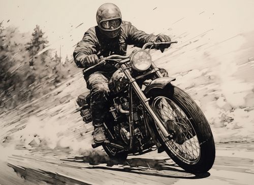 Plakat z serii abstrakcja zatytułowany Na Pełnej Prędkości. Ta monochromatyczna ilustracja uchwyciła motocyklistę w pełnym ruchu, przemierzającego drogę z wysoką prędkością. Dynamiczne pociągnięcia pędzla i grę światłocienia nadają plakatowi poczucie szybkości i ruchu, podkreślając siłę i energię zarówno jeźdźca, jak i maszyny. W tle zamazane linie sugerują przemykający krajobraz, co wzmacnia wrażenie prędkości. Plakat ten jest idealny dla miłośników motocykli, jako dekoracja w garażach, warsztatach lub jako wyrazisty element wystroju w przestrzeniach mieszkalnych, inspirując do poczucia wolności i przygody.