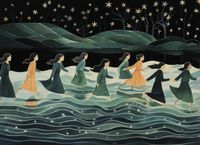 Plakat z serii wnętrza zatytułowany Nocna Procesja, przedstawia sylwetki kobiet, idących w rytmicznym ruchu przez wody, pod tajemniczym, gwiaździstym niebem. Styl plakatu, z płynnymi liniami i miękkimi pastelowymi kolorami, tworzy uczucie spokoju i onirycznej atmosfery. Postacie są przedstawione w ruchu, z włosami rozwianymi przez nocny wiatr, co dodaje dziełu poczucia tajemnicy i ruchu. Ten plakat idealnie nadaje się do wnętrz, które chcą wyrazić poczucie spokoju, introspekcji oraz kobiecej siły i solidarności, takich jak prywatne biblioteki, pokoje medytacyjne, a także przestrzenie publiczne, które pragną inspirować swoich gości do głębszego zastanowienia się nad otaczającym ich światem.