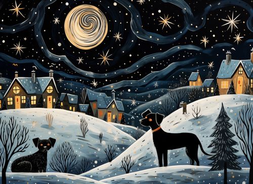 Plakat z serii abstrakcja zatytułowany Nocny Psi Patrol. To urokliwe dzieło sztuki zanurza widza w idyllicznym, zimowym pejzażu, gdzie tajemnicze postacie dwóch czujnych psów wyłaniają się na tle malowniczej wsi oświetlonej ciepłym światłem z okien. Nad sceną unosi się oszałamiające niebo pełne gwiazd z hipnotyzującym wirującym układem, który wywołuje poczucie głębi kosmosu. Śnieżny krajobraz i delikatnie padające płatki śniegu dodają kompozycji spokojnego nastroju, idealnego do kontemplacji i marzeń. Plakat ten będzie doskonałym dodatkiem do przestrzeni takich jak pokoje dziecięce, miejsca wypoczynkowe lub jako ciepły akcent w zimowe wieczory w każdym domu lub kawiarni.