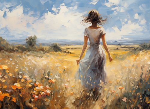 Plakat z serii pejzaże zatytułowany Podmuch Lata, przedstawia kobietę w lekkiej sukience, idącą przez kwitnące pole w kierunku otwartego horyzontu. Jej włosy rozwiewane przez wiatr dodają kompozycji dynamiki i lekkości. Styl plakatu, przypominający impresjonizm, z jego żywymi pociągnięciami i jasnymi barwami, oddaje uczucie ciepła i radosnego spokoju. Postać kobiety, choć anonimowa, jest wyraźnie zatopiona w chwili, co nadaje scenie uniwersalny charakter refleksji i osobistego poszukiwania. Plakat ten doskonale wpasuje się do wnętrz, które chcą oddać atmosferę spokoju, optymizmu i kontemplacji, takich jak salony, pokoje relaksacyjne, studia jogi, a także jako odświeżający element w przestrzeniach biurowych, przynosząc inspirację i uczucie pozytywnego nastawienia do życia.