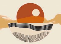 Plakat z serii boho zatytułowany Pół na Całość. Plakat przedstawia uproszczony, geometryczny krajobraz, w którym słońce jest głównym bohaterem, stanowiąc centralny punkt kompozycji. Jego okrągły kształt dominuje na tle abstrakcyjnych wzgórz i falujących linii, które mogą przypominać wzburzone morze lub piaszczyste wydmy. Kolorystyka plakatu to spokojna paleta ciepłych odcieni pomarańczu, beżu i czerni, która nadaje dziełu głębi i kontrastu.Ten plakat będzie wspaniałym dodatkiem do wnętrz urządzonych w ciepłych, ziemistych barwach, gdzie może dodać nowoczesnego charakteru. Idealnie sprawdzi się jako punkt centralny w przestrzeniach, które korzystają z naturalnego światła, takich jak salony, gabinety czy przestronne hole.