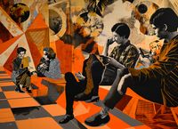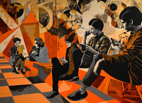 Plakat z serii pop art zatytułowany Przestrzeń Do Dialogu. Prezentuje grupę ludzi w stylizowanych retro ubraniach, zanurzonych w konwersacji i zatopionych w swoich myślach, co sugeruje głębię ludzkiego połączenia i introspekcji. Tło plakatu to geometryczne i abstrakcyjne formy w odcieniach pomarańczu, żółci i brązu, nawiązujące do lat 60. i 70. XX wieku, wprowadzając elementy vintage do nowoczesnej przestrzeni. Postacie wydają się pochłonięte rozmową, a ich pozy i gesty odzwierciedlają osobistą wymianę i komunikację. Plakat ten jest idealny do kawiarni, salonów, bibliotek, lub jako inspirujący akcent w domowych biurach, zachęcając do refleksji i twórczego dialogu.