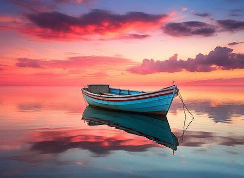 Plakat z serii pejzaże zatytułowany Spokój przed Połowem. Ta malownicza scena przedstawia samotną łódź na tafli wody, z tłem zachodzącego słońca, które barwi niebo i powierzchnię wody w odcienie czerwieni i pomarańczy. Odbicie łodzi w wodzie tworzy symetrię, która wprowadza w stan medytacji i spokoju. Plakat doskonale nadaje się do pomieszczeń, gdzie chcemy wprowadzić elementy natury i harmonii, takich jak salony, gabinety czy przestrzenie wellness.