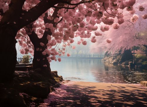 Plakat z serii motywy wschodnie zatytułowany Spokój Sakury przenosi nas do spokojnego zakątka, gdzie rozkwitłe drzewa wiśni tworzą bajkowy baldachim nad lśniącym jeziorem. Subtelna gra światła i cienia na delikatnych różowych płatkach w połączeniu z łagodnym odbiciem wody tworzy atmosferę spokoju i kontemplacji. Ta scena jest synonimem wiosennej odnowy i piękna, która z łatwością wniesie element romantycznej natury do każdego wnętrza. Idealnie odnajdzie się w przestrzeniach wypoczynkowych, pokojach gościnnych, czy salonach spa, dodając im uroku i subtelnej elegancji.