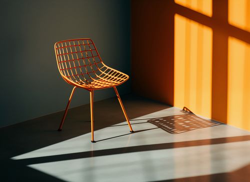 Plakat z serii wnętrza zatytułowany Świetlista Gra. Prezentuje on minimalistyczne podejście do designu, gdzie każda linia i kształt ma swoje znaczenie. Jasne odcienie pomarańczu rzucające się na prostą, ale stylową metalową krzesło tworzą dynamiczny efekt cienia i światła, który jest jednocześnie subtelnym, ale i wyrazistym elementem dekoracyjnym. Idealny dla nowoczesnych przestrzeni biurowych lub mieszkalnych, wprowadzając do nich artystyczną atmosferę z nutą awangardy. To dzieło sztuki doskonale komponuje się z surową elegancją współczesnych, urbanistycznych wnętrz.