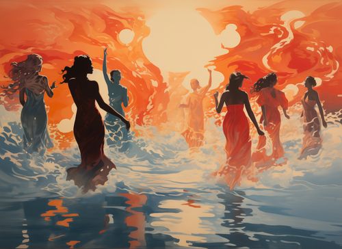 Plakat z serii wnętrza zatytułowany Taneczny Żar, przedstawia grupę osób tańczących w rytmicznych ruchach w wodzie, z tłem zapalającego się nieba w odcieniach ciepłego pomarańczu i czerwieni. Postacie są przedstawione w dynamicznych pozach, z włosami rozwianymi przez wiatr, co nadaje obrazowi wrażenie ruchu i pasji. Styl plakatu, z jego płynnymi liniami i żywymi kolorami, tworzy uczucie energii i życia. Ten plakat idealnie nadaje się do wnętrz, które chcą uchwycić esencję ruchu, radości i wolności, takich jak studia taneczne, kreatywne przestrzenie pracy, a także jako inspirujący element w domach, gdzie może stanowić przypomnienie o pięknie wspólnych chwil i celebracji życia.
