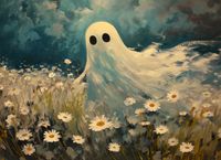 Plakat z serii abstrakcja zatytułowany Widmo Dawnej Łąki.Plakat przedstawia sympatyczną, uproszczoną postać ducha unoszącego się nad łąką pełną białych stokrotek. Duch ma duże, okrągłe oczy, co nadaje mu przyjazny wygląd. Tło to dynamicznie namalowane pociągnięcia pędzlem w odcieniach niebieskiego i brązu, co sprawia wrażenie burzowego nieba lub wschodzącej burzy. Postać ducha kontrastuje z ciemniejszym tłem, a jasne, żywe kolory kwiatów dodają kompozycji ciepła i lekkości. To połączenie elementów może symbolizować nadzieję i pokój w obliczu przeciwności, nadając plakatowi głębsze znaczenie. Idealny do dekoracji wnętrz dla osób ceniących sobie odrobinę humoru i optymizmu.