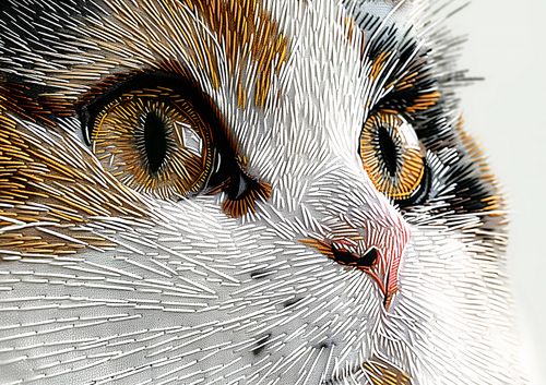 Plakat z serii abstrakcja zatytułowany Niktowany Kot. Ukazuje zbliżenie na twarz kota, wykonane z niezwykłą dbałością o detale, co sprawia wrażenie trójwymiarowości. Całość jest utrzymana w technice przypominającej szycie lub haft, gdzie każda nitka została precyzyjnie ułożona, aby naśladować naturalne linie futra. Olśniewające, złote oczy kota są pełne wyrazu i życia, przyciągają uwagę i są centralnym punktem kompozycji. Złożone z wielu warstw i kolorów linie tworzą dynamiczną i niemal hipnotyzującą teksturę. Plakat ten byłby doskonałym wyborem dla miłośników sztuki i zwierząt, wnosząc element elegancji i oryginalności do każdego wnętrza.