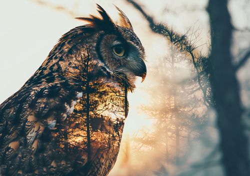 Plakat z serii natura zatytułowany Sowi Duch. Prezentuje on majestatyczną sylwetkę sowy zlewaną z tłem o zachodzie słońca w lesie, co podkreśla jej dziką naturę i instynktowną mądrość. Ciepłe odcienie zachodzącego słońca i sylwetki drzew przenikają się z delikatnym konturem sowy, tworząc wrażenie jedności z naturą. Plakat ten idealnie wpasuje się w przestrzenie takie jak gabinet, biblioteka lub salon, gdzie może inspirować do refleksji i spokoju, przypominając o głębokich, nieodkrytych aspektach natury.