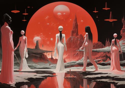 Plakat z serii pop art zatytułowany Wędrowcy z Innego Świata. Przedstawia on grupę postaci w długich, płynnych szatach, stojących na obcej planecie z olbrzymim, czerwonym słońcem na horyzoncie. Ich pozycje i kontury są wyrafinowane i eleganckie, a ich twarze są ukryte, co dodaje elementu tajemniczości. Sceneria planety, z jej nierealnymi formacjami skalnymi i odbiciami w cichych wodach, wzbogacona jest o latające obiekty, które przypominają niezidentyfikowane obiekty latające, tworząc wrażenie zaawansowanej, ale pustynnej cywilizacji. Ta scena jest pełna spokoju, izolacji i niekończącej się przestrzeni, doskonale nadając się do miejsca, które pragnie wnieść kosmiczną głębię i fantazję do swojego otoczenia.