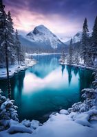Plakat z serii pejzaże zatytułowany Górzyste Prześwity. Ten plakat ukazuje zachwycający zimowy krajobraz z krystalicznie czystym jeziorem, które odbija lśniące szczyty górskie i pastelowe barwy zachodzącego słońca. Obfite śnieżne pokrywy na drzewach i brzegach jeziora dodają scenie poczucia spokoju i izolacji. Idealny do wnętrz, które chcą wprowadzić elementy spokojnego piękna natury, ten plakat jest doskonałym dodatkiem do przestrzeni mieszkalnych, biurowych lub jako ukojenie w miejscach publicznych, wprowadzając atmosferę wyciszenia i odprężenia.