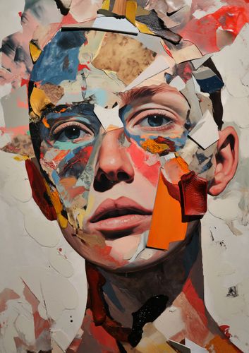 Plakat z serii abstrakcja zatytułowany Podział Samego Siebie, przedstawia twarz złożoną z rozmaitych, nieregularnych kawałków, które łączą się w zaskakująco spójną całość. Każdy fragment jest jak pociągnięcie pędzla, pełne tekstury i żywych kolorów, od ciepłych odcieni pomarańczy i czerwieni, po subtelne biel i brąz. Wzrok widza jest przyciągany do intensywnych, realistycznych oczu, które wydają się obserwować z za rozdrobnionej mozaiki. Plakat ten mógłby znaleźć swoje miejsce w nowoczesnych galeriach sztuki, studiach projektowych, lub jako odważny akcent w minimalistycznych, współczesnych przestrzeniach. Jego abstrakcyjny, ale wyrazisty design stwarza punkt konwersacyjny i może być interpretowany jako komentarz do złożoności ludzkiej tożsamości i percepcji.