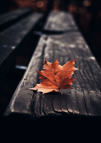 Plakat z serii natura zatytułowany Pojedynczy Liść. Ten plakat przedstawia pojedynczy, jasnobrązowy liść klonu, spoczywający na ciemnym, drewnianym tle ławki parkowej. Głębokie, nasycone kolory i wyraźny kontrast między liściem a ciemnym tłem, wywołują uczucie intymności i refleksji. Idealny dla przestrzeni, które chcą oddać hołd zmienności sezonów i subtelnemu pięknu natury, ten plakat wprowadza ciepło i spokój do każdego domu, biura, czy miejsca publicznego, zachęcając do chwili zadumy i spokoju.