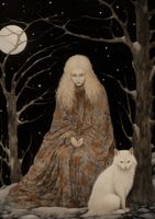 Plakat z serii wnętrza zatytułowany Stróżka Leśna. Ta eteryczna praca artystyczna ukazuje postać kobiecą, owiniętą w szatę z motywem leśnym, zatopioną w kontemplacji pod gałęziami drzew oplecionych przez śnieg i w blasku pełnego księżyca. Jej spokojna obecność i blady odcień skóry kontrastują z ciemnością nocy, a towarzyszący jej biały wilk dodaje elementu dzikości i tajemniczości. Plakat oddaje uczucie spokoju i jedności z naturą, a jednocześnie wzbudza ciekawość dotyczącą ukrytych opowieści i starych legend. Idealny dla miłośników fantastyki, mitologii, oraz tych, którzy pragną wprowadzić do swojego wnętrza elementy oniryczne i magiczne.