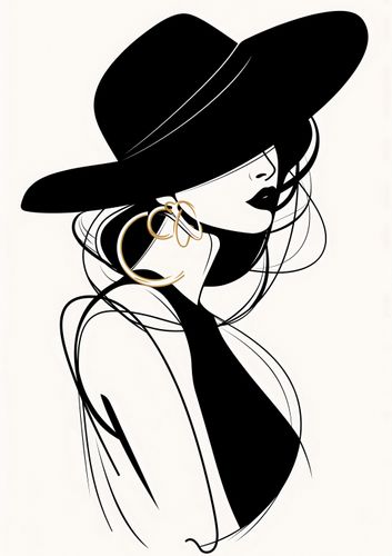 Plakat z serii minimalistyczne zatytułowany Uwikłana Elegancja. Grafika przedstawia sylwetkę tajemniczej, eleganckiej postaci w szerokim kapeluszu, co nadaje kompozycji aurę wyrafinowania i gracji. Stylizowany portret, wykonany czernią i bielą z akcentami złota, emanuje klasyką i nowoczesnością. Silny kontrast i płynne linie podkreślają zmysłowy kształt ujęcia oraz wytworność biżuterii, sugerując wyrafinowany gust i pewność siebie modelki. Plakat ten idealnie wpasuje się w eleganckie wnętrza, gdzie klasyka spotyka się z nowoczesnością, doskonale nadając się do salonów, sypialni, garderoby lub jako elegancki akcent w przestrzeniach komercyjnych, takich jak salony piękności czy butiki.