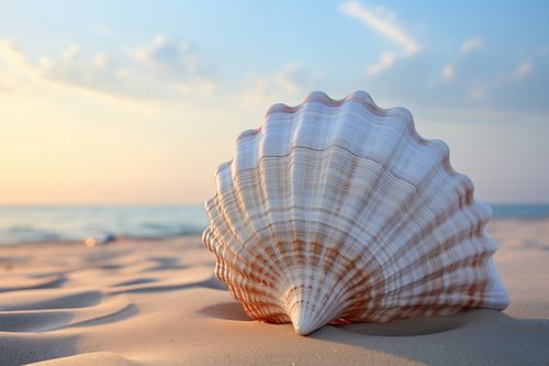 Plakat z serii natura zatytułowany Echo Morza. Delikatne, pastelowe barwy muszli występujące na pierwszym planie, z jej wyraźnymi liniami i subtelnym przejściem kolorów od kremowego do różowego, kontrastują z dynamicznym tłem zachodzącego słońca nad morzem. Złote refleksy światła na wodzie i miękki, piaskowy pierwszy plan tworzą poczucie głębi i spokoju. Idealny do wnętrz o tematyce morskiej, relaksacyjnych spa oraz jako element dekoracyjny w pokojach hotelowych z widokiem na morze.