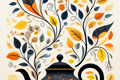 Plakat z serii wnętrza zatytułowany Jesienna Melodia. Czarny dzbanek do herbaty, zdobiony subtelnymi złotymi i pomarańczowymi wzorami, z którego wyrastają kolorowe liście i kwiaty, przypominające jesienny ogród pełen życia. Kompozycja wypełniona jest ciepłymi barwami złota, pomarańczy i brązu, które kontrastują z eleganckim czernią dzbanka. Te detale dodają obrazowi nuty elegancji i spokoju. Świetnie sprawdzi się w herbaciarniach, księgarniach jak i również w domowych salonach czy biblioteczkach.