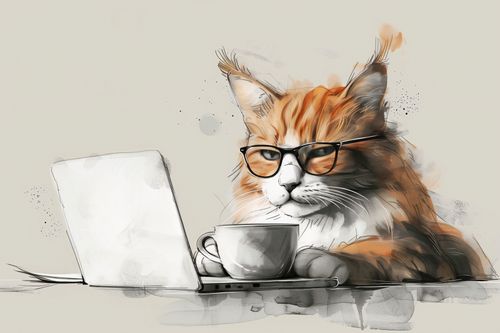 Plakat z serii abstrakcja zatytułowany Nie przed Kawusią. Przedstawia uroczy obraz kota o rudym umaszczeniu, który nosi okulary i wydaje się być zaczytany w ekranie laptopa. Scena jest przedstawiona w ciepłych, nasyconych barwach, które podkreślają miękkość i puszystość futra kota. Elementy graficzne, takie jak plamy i rozpryski farby, nadają kompozycji artystycznego charakteru. Filiżanka kawy umieszczona obok laptopa dodaje codziennej atmosfery, sugerując, że może to być obrazek z domowego biura lub miejsca relaksu. Ten plakat mógłby być idealnym elementem dekoracyjnym dla miłośników kotów i tych, którzy cenią sobie humor oraz lekkość w aranżacji swojego wnętrza, zarówno w domowym biurze, jak i w przestrzeni wypoczynkowej.