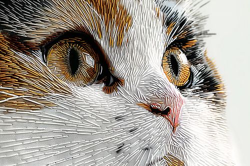 Plakat z serii abstrakcja zatytułowany Niktowany Kot. Ukazuje zbliżenie na twarz kota, wykonane z niezwykłą dbałością o detale, co sprawia wrażenie trójwymiarowości. Całość jest utrzymana w technice przypominającej szycie lub haft, gdzie każda nitka została precyzyjnie ułożona, aby naśladować naturalne linie futra. Olśniewające, złote oczy kota są pełne wyrazu i życia, przyciągają uwagę i są centralnym punktem kompozycji. Złożone z wielu warstw i kolorów linie tworzą dynamiczną i niemal hipnotyzującą teksturę. Plakat ten byłby doskonałym wyborem dla miłośników sztuki i zwierząt, wnosząc element elegancji i oryginalności do każdego wnętrza.
