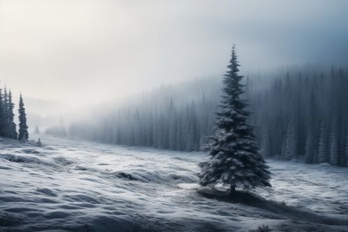 Plakat z serii pejzaże zatytułowany Samotna Choinka. Ta grafika ukazuje malowniczy, zimowy krajobraz z dominującą pojedynczą, okazałą choinką pokrytą śniegiem. Otoczona przez delikatnie zasnutej mgłą lasy, podkreśla spokój i majestatyczną ciszę zimy. Delikatne odcienie błękitu i bieli tworzą wrażenie chłodu i spokoju. Ten plakat będzie idealnym dodatkiem do każdego wnętrza, gdzie chcemy wprowadzić atmosferę spokoju i kontemplacji, świetnie sprawdzi się w przestrzeniach takich jak gabinety relaksacyjne, spa, a także jako element dekoracyjny w domowych salonach lub sypialniach.